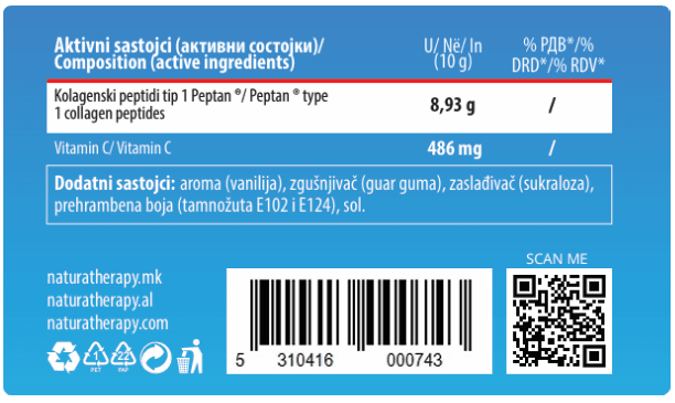 • Hidrolizirani kolagenski peptidi za sigurnu apsorpciju i efikasnost.