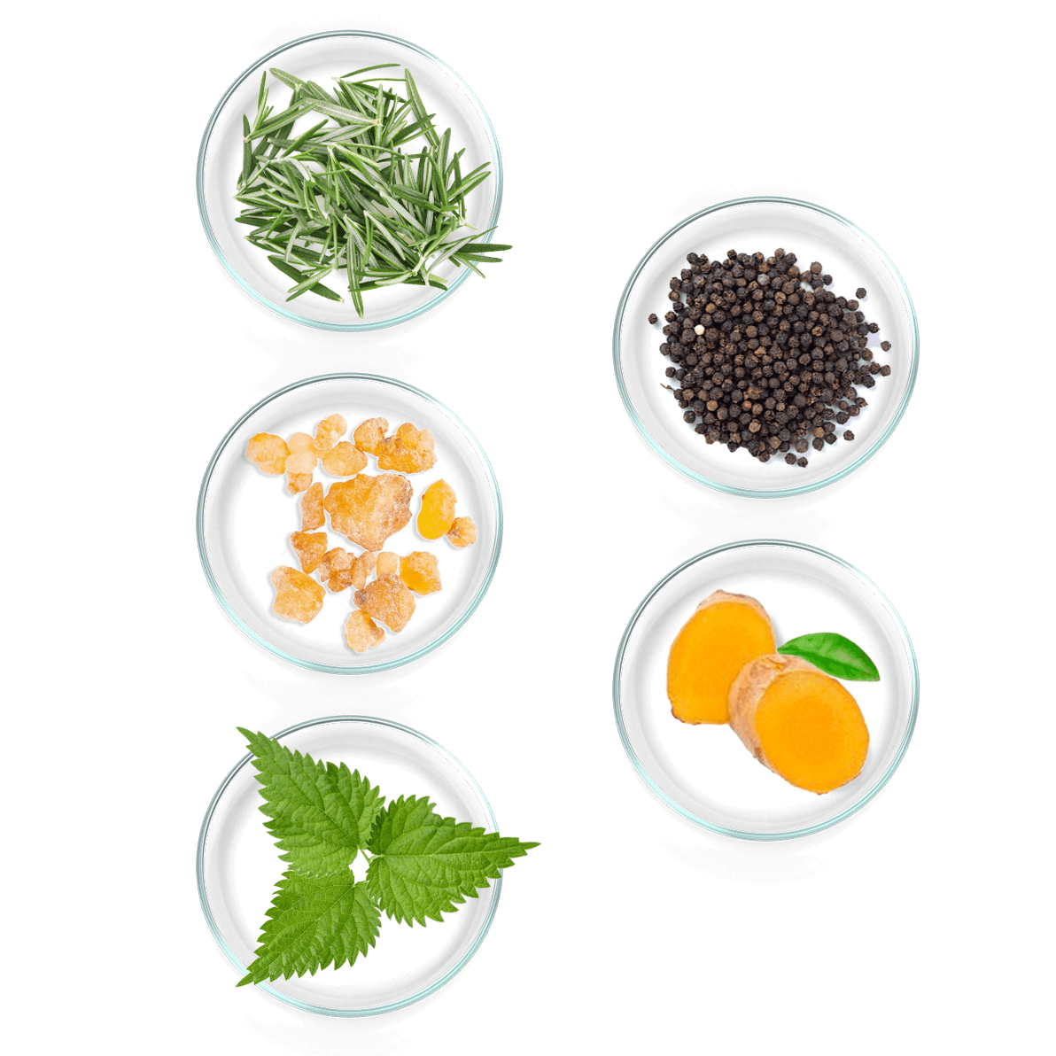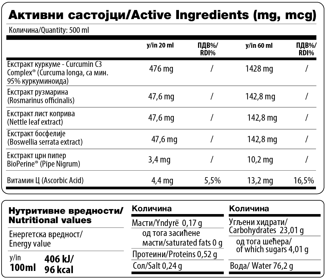 - Curcumin C3 Complex®– klinički dokazan, patentiran, standardizovan ekstrakt kurkume kompanije SABINSA iz SAD (dobija se iz korena biljke Curcuma Longa) sa najmanje 95% 3 vrste bioaktivnih kurkuminoida (kurkumin, demetoksikurkumin (DMC) i bisdemetoksikurkumin (BDMC)). Visoka koncentracija kurkuminoida pruža snažan antiinflamatorni efekat.